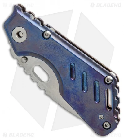 This Mick Strider Custom Stub features a blue anodized titanium handle with an orange peel texture. The tanto blade is satin/stonewash finished premium stainless steel, marked on the blade choil “M. Strider.” Comes in a padded zipper pouch with a “Stub” patch.