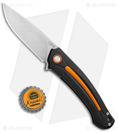 This model of the Arvenis features a stonewashed M390 blade and a G-10 handle with orange aluminum inlays, pivot collar, and satin screws.
