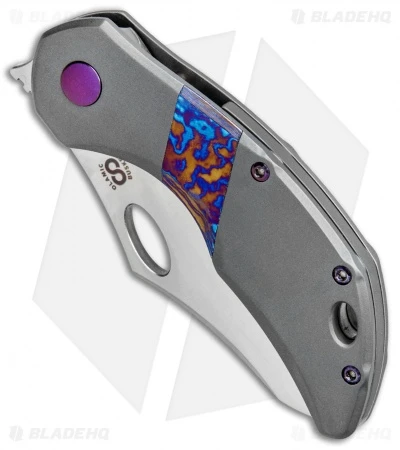- Titanium handle with timascus inlay and purple hardware.