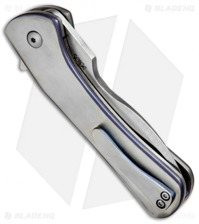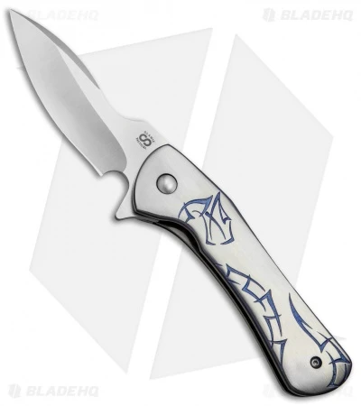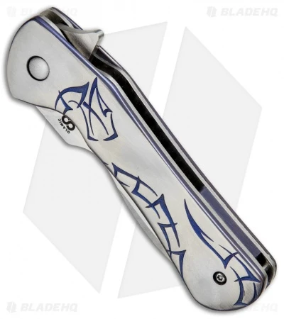 The Olamic Cutlery Gambit is a unique flipper design by Serge Panchenko that strays a bit from traditional knife design. Despite its unusual appearance, the Gambit is a pleasure to use and offers extreme comfort in the hand. This knife features a satin finished CPM-S30V blade. The handle is made from titanium with a carved pattern on the front and blue anodized accents around the edge of the scales. Includes a tip-up titanium pocket clip for secure carry.