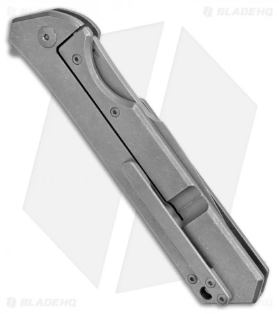The Rainmaker is another fine flipper from Olamic Cutlery. It showcases the same custom details seen on Wayfarer folding knives, including a caged bearing pivot, titanium frame, and unique material and finish options. This Rainmaker has a Bohler M390 stainless steel harpoon blade with a compound grind. It has a dark wash finished titanium handle, clip, and backspacer. Sleek and stylish looks, paired with a build that is first-class, make the Rainmaker a solid purchase.