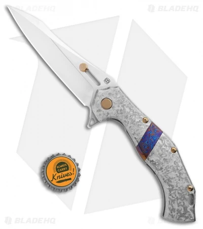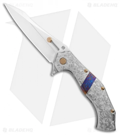 This Soloist exhibits a Agent blade style with a satin finish. The titanium handle has a Frosty finish and boasts a Timascus inlay, clip, and pivot with gold colored hardware and backspacer.