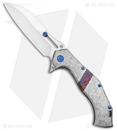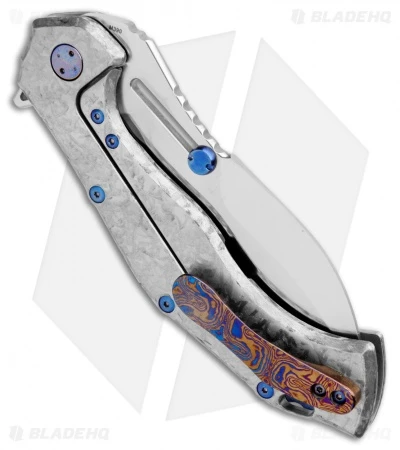 This Soloist exhibits a Scout blade style with a satin finish. The titanium handle has a Frosty finish and boasts a Timascus inlay, clip, and pivot with blue hardware and backspacer.