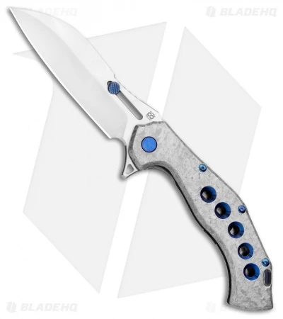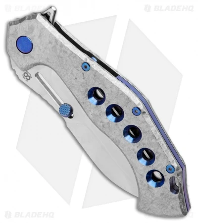 This Soloist exhibits a Scout blade style with a satin finish. The titanium handle has a Frosty finish and blue hardware, boasting five stylistic holes accented in blue.