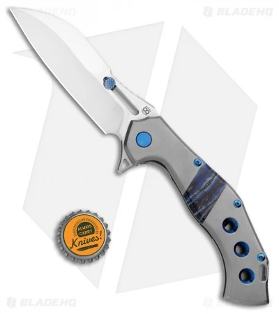 This Soloist exhibits a Scout blade style with a satin finish. The titanium handle has a bead blast finish and blue hardware, boasting five stylistic holes accented in blue. A layered Blue Mammoth inlay completes the piece.