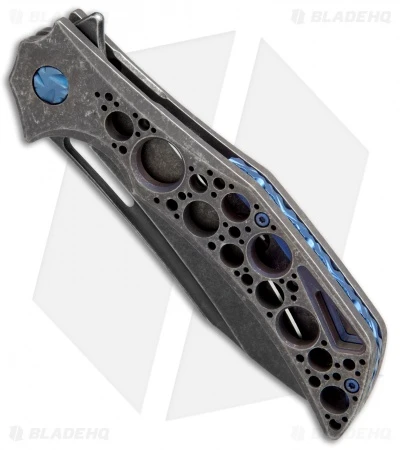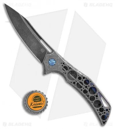 The Swish from Olamic Cutlery is a sleek EDC flipper knife with a dramatic modern design. It has a slim profile titanium handle, contoured in all the right places for a superior grip. The large Elmax steel blade offers a modified spear design with a curved edge and a sharp point. A blue sculpted backspacer and a stout titanium ball bearing pocket clip finish off the piece.