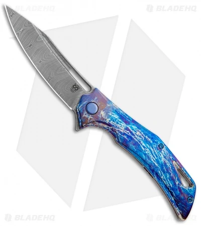 This Swish model features an Entropic titanium handle and a Damasteel pocket clip with blue hardware and a Damasteel blade.