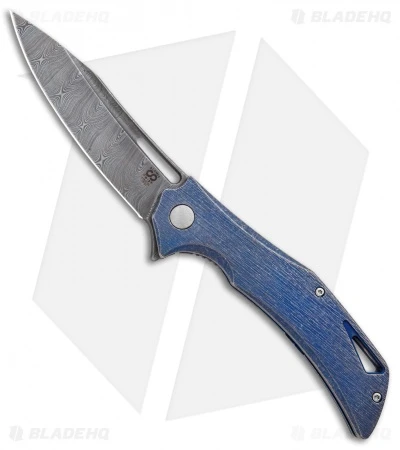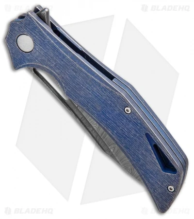 This Swish model features a Kinetic blue titanium handle and pocket clip with satin hardware and a damasteel blade.