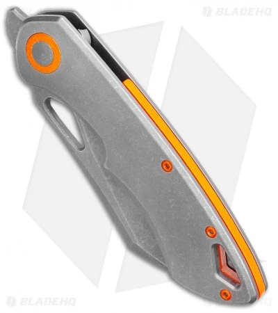 This WhipperSnapper model comes equipped with a stonewashed Wharncliffe blade and a titanium handle with orange accents and an orange pivot collar.