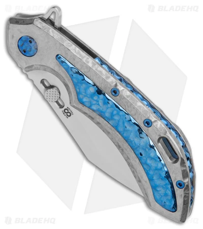- Frosted titanium handle with a blue anodized nugget textured inlay and blue hardware.