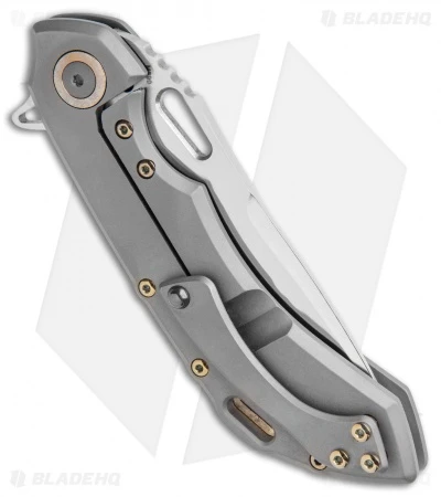 This Wayfarer 247 model sports a dak blasted titanium handle with 3 bronze-lipped holes, bronze hardware, and a tanto blade in a satin finish.