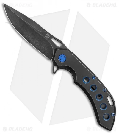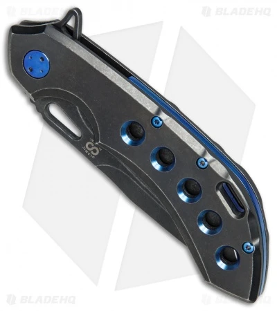 This Wayfarer model sports a 5 hole pattern titanium handle and a spear point blade in a black PVD wash. Blue finished chamfers, hardware and backbar add an elegant touch to the piece.