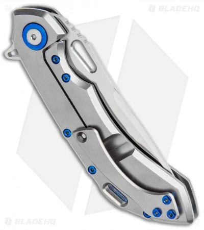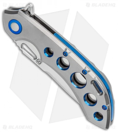 This Wayfarer 247 model sports a light blasted titanium handle with 5 blue-lipped holes, blue hardware, and a tanto blade in a satin finish.