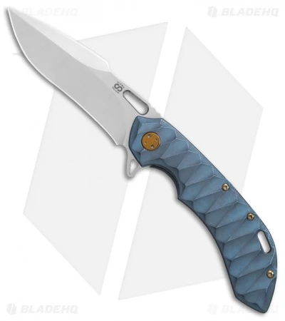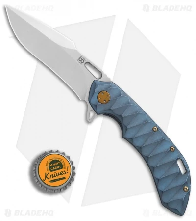 This Wayfarer model sports a “bluewash” scalloped titanium handle with a bronze seabed backbar and matching anodized hardware. The harpoon blade comes in a satin finish.