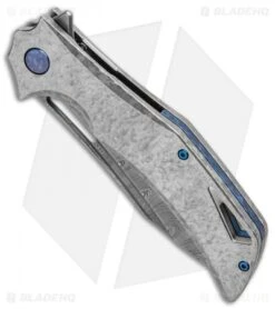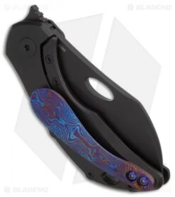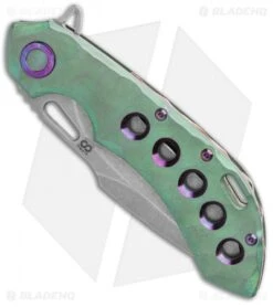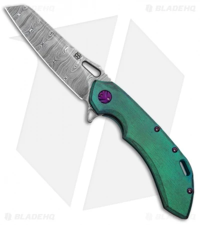 This Wayfarer 247 from Olamic Cutlery model has green titanium handles with a Kinetic Rainforest finish, a “Sheepscliffe” Damasteel blade, caged ball bearing system, purple titanium hardware, lock-bar insert with integrated lockbar stabilizer and floating green titanium backspacer. Quick and smooth action due to a strong ceramic detent ball and skeletonized flipper tab is a joy to open. A generous finger groove and spine jimping makes the 247 Wayfarer comfortable and secure in hand and can be discreetly carried with its ceramic ball bearing tri-mount pocket clip.