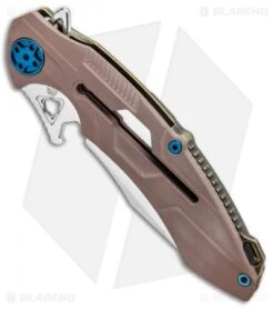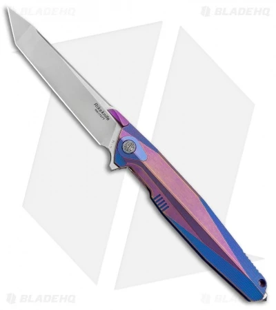 This version of the 1707T is outfitted with a purple and blue anodized titanium handle and a satin finished tanto blade. The 1707T is similar in design to the 1507T, but with a one-piece integral handle. This ultra-modern design is accentuated by a slim, narrow handle that slides comfortably into the hand or pocket. The blade flows cleanly out of the handle and features a flipper opener and titanium thumb studs. A titanium pocket clip and glass breaker/striker round out the design.