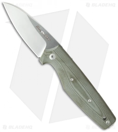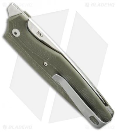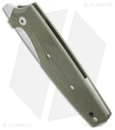 The Dan2 has a wharncliffe blade and this model has a green G-10 handle with a titanium spacer and stainless steel pocket clip.