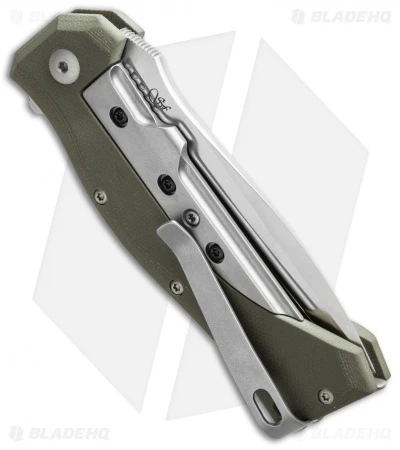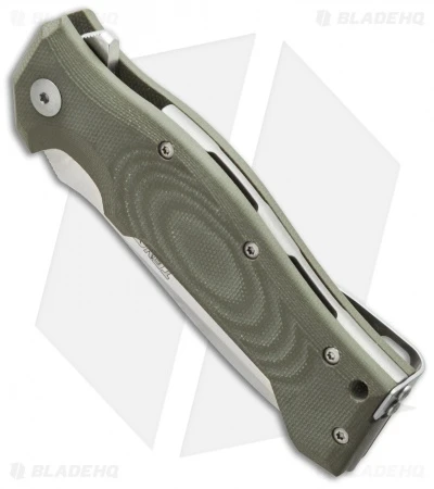 This model has a green G-10 handle and satin finished Bohler N690 steel blade with a graceful swedge and flipper opener. Stainless thrust bearings optimize opening efficiency and provide reliable operation.
